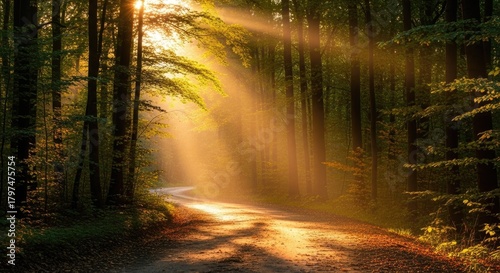 © Yohanessoekamti, Naklejka premium Golden Sunbeams Illuminating a Serene Forest Path through Lush Green Trees