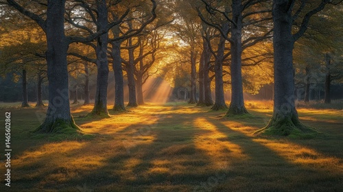 Fototapeta premium Golden sunbeams pierce a tranquil forest