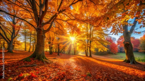 Naklejka premium Golden sunbeams pierce through vibrant autumn trees illuminating a leaf...