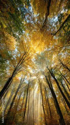 Obraz premium Golden sunbeams piercing through the canopy of a vibrant autumn forest