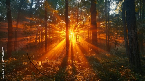 © NuriAlam, Fototapeta premium Golden sunburst shines through a dense forest of tall trees, illuminating the ground