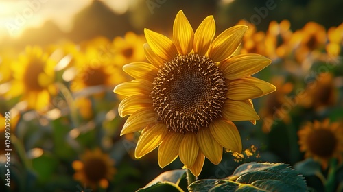 Fototapeta premium Golden sunflower in field at sunset