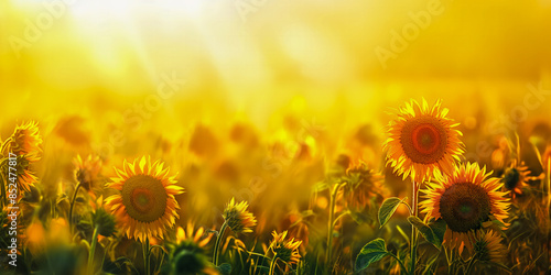 Fototapeta premium Golden sunflowers standing tall in a vibrant meadow, creating a sunny and joyful background. Great for summer designs, advertisements, and nature projects. Copy space