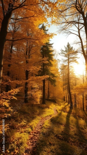 © photohappy, Fototapeta premium Golden sunlight bathes a panoramic autumn forest scene, gold, scenic, peaceful