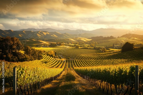 Fototapeta premium Golden sunlight bathes rolling vineyards, showcasing lush green