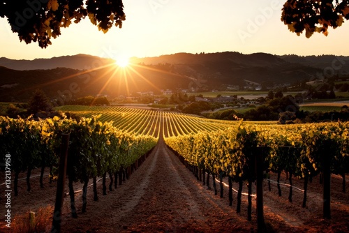 © c80, Naklejka premium Golden sunlight bathes the vineyard as rows of grapevines stretch towards the horizon at dusk in a scenic valley