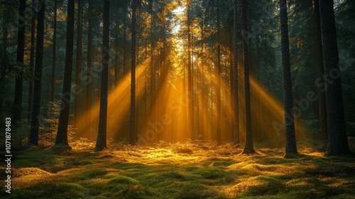 Fototapeta premium Golden sunlight beams through trees.