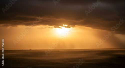 © Desi, Fototapeta premium Golden Sunlight Breaks Through Dark Clouds Over a Misty Landscape