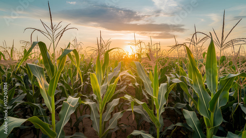 Fototapeta premium Golden sunlight casts a warm glow over a lush cornfield at sunset near a...