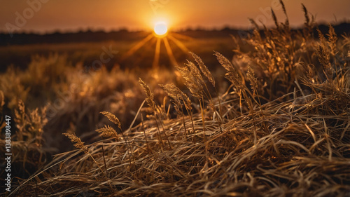 © Farhad, Fototapeta premium Golden sunlight casts warm hues over the wheat field at sunset, showcasing nature's beauty in rural landscape