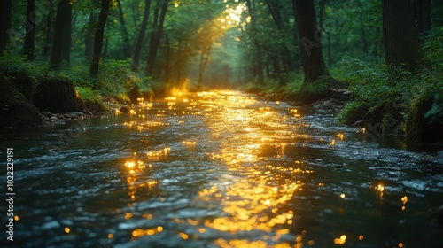 Obraz premium Golden sunlight dances on a winding river weaving through a lush forest,...