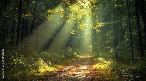 © Kopgz-41, Fototapeta premium Golden Sunlight Dappled Path Through Autumn Forest