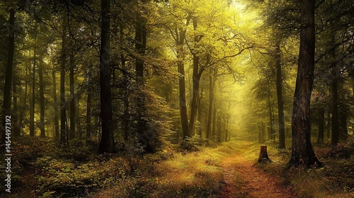 © nani, Fototapeta premium Golden sunlight filtering through a dense forest path.
