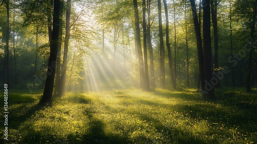 © Barokahe, Fototapeta premium Golden sunlight filtering through a lush green forest in springtime