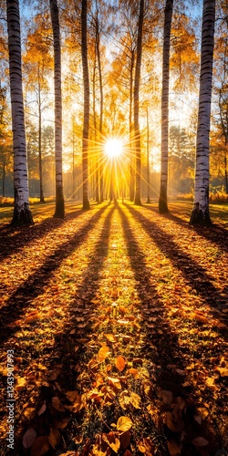 Obraz premium Golden Sunlight Filtering Through Autumnal Birch Tree Forest with Fallen...
