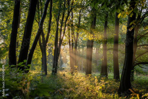 Fototapeta premium Golden Sunlight Filtering Through Lush Green Forest at Dawn with Soft Glowing...