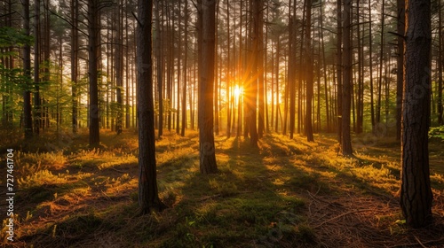 Obraz premium Golden sunlight filters through tall pine trees, highlighting the forest's...