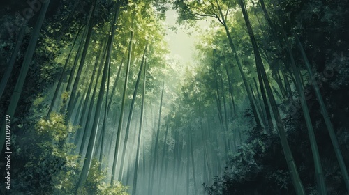 © Harris, Naklejka premium Golden sunlight filters through the dense foliage of an ancient forest, illuminating a misty path that winds through the verdant landscape