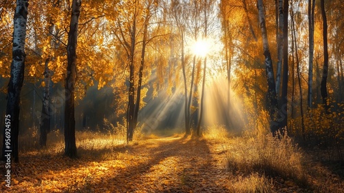 © vannet, Fototapeta premium Golden sunlight filters through trees as autumn leaves