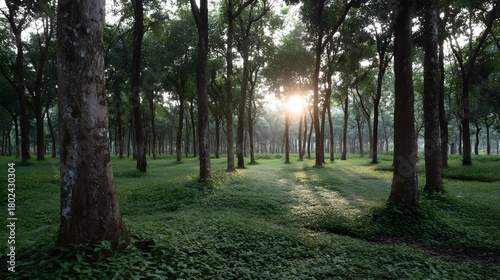 © Bussakon, Naklejka premium Golden sunlight filters through trees in a peaceful forest grove casting long shadows on the verdant ground