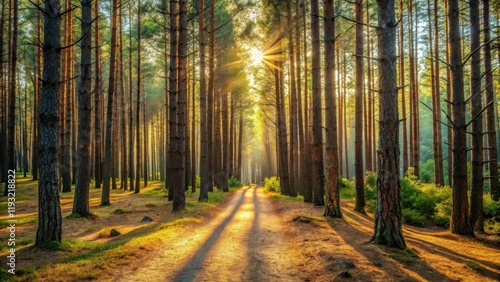Obraz premium Golden Sunlight Illuminates a Forest Path at Dawn
