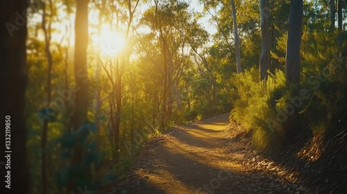 Fototapeta premium Golden sunlight illuminates a tranquil forest path, evoking peace and natural...