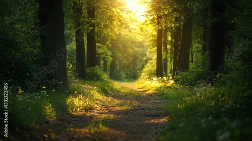 Obraz premium Golden sunlight illuminates a tranquil forest path, evoking peace and natural...