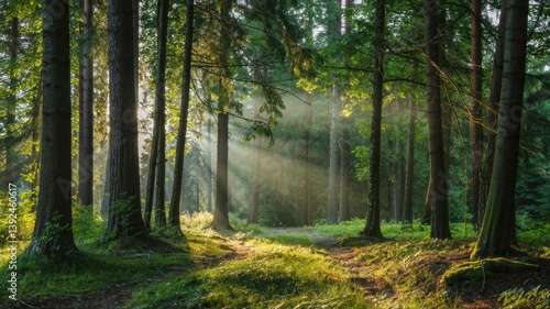 Obraz premium Golden sunlight illuminates a tranquil forest path, evoking peace and natural...