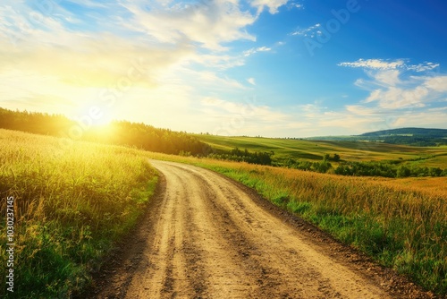 Obraz premium Golden sunlight illuminates a winding dirt path through lush green meadows at...