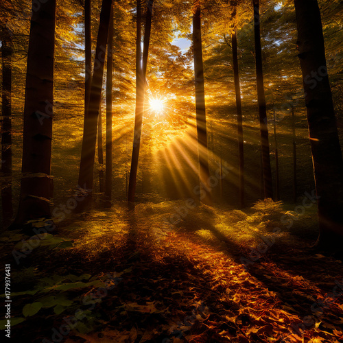 Fototapeta premium Golden Sunlight Illuminates an Autumn Forest with Serene Glow