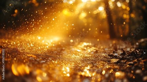 Naklejka premium Golden Sunlight Illuminates Forest Floor With Water Droplets