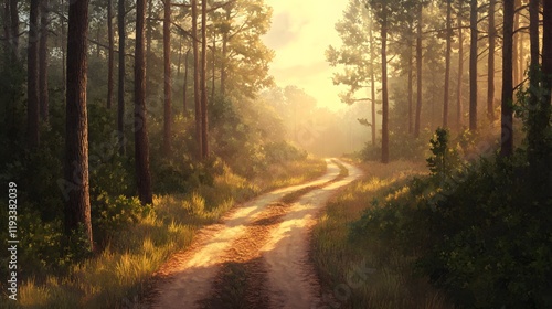 Fototapeta premium Golden Sunlight Illuminates Forest Path Winding Through Trees