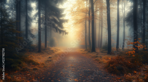 Naklejka premium Golden Sunlight Illuminates Forest Path With Autumn Foliage Reflections. Foggy Morning Path Through Forest With Vibrant Autumn Leaves