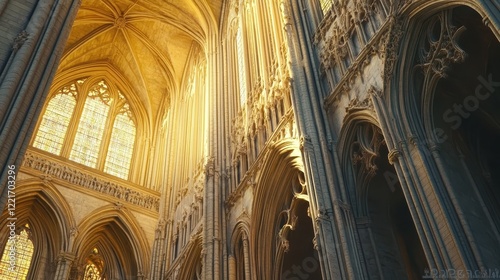 © KHOLIS, Fototapeta premium Golden Sunlight Illuminates Gothic Cathedral Interior Architecture