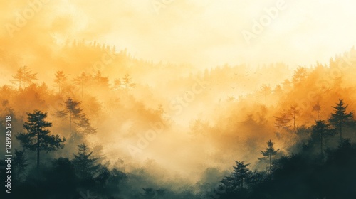 © addymawy, Naklejka premium Golden sunlight illuminates misty landscape with tall evergreen trees