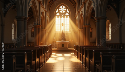 Fototapeta premium Golden Sunlight Illuminating a Grand Cathedral Interior
