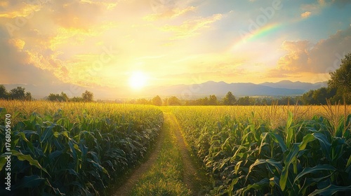 © alu, Fototapeta premium Golden sunlight illuminating a lush green cornfield with a clear sky featuring a soft rainbow above distant mountains in a peaceful rural landscape