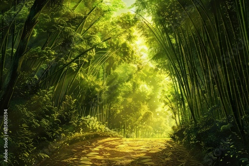 © ylivdesign, Naklejka premium Golden sunlight illuminating a path through a dense bamboo forest