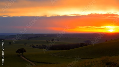 Obraz premium Golden sunlight illuminating rolling green hills, spreading warm hues across...
