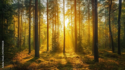 © Guruji, Fototapeta premium Golden Sunlight in the Forest