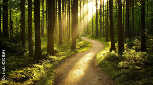 © Bonsales, Fototapeta premium Golden sunlight is illuminating a winding dirt path through a lush green forest