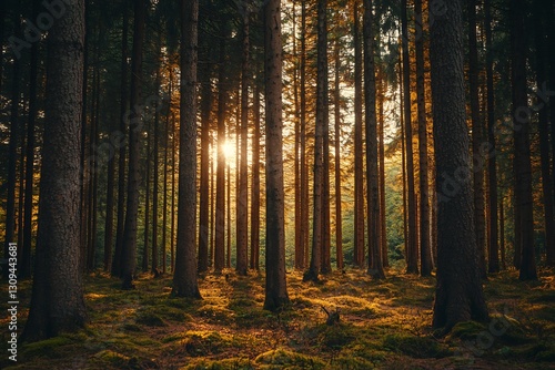 Fototapeta premium Golden Sunlight Piercing Through the Forest