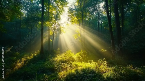 © Joachim, Naklejka premium Golden sunlight pours through lush, towering trees in a serene forest, casting light and shadow on the vibrant greenery, evoking peace, nature's beauty, and tranquility.
