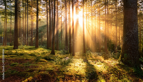 © Dorian, Naklejka premium golden sunlight rays through forest trees