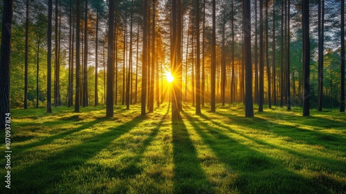 © irawan710, Fototapeta premium Golden sunlight shines through tall pine trees in a forest at sunset.