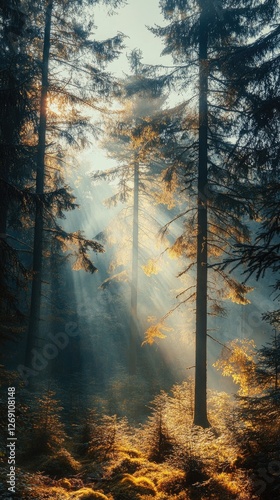 © Lubos Chlubny, Obraz premium Golden sunlight shining through foggy autumn forest