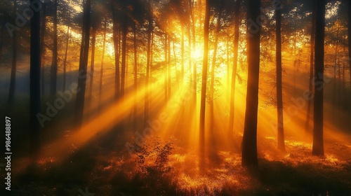 Fototapeta premium Golden Sunlight Streaming Through a Foggy Forest