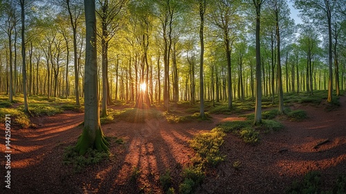Naklejka premium Golden sunlight streaming through lush green spring forest trees art calm path park woods flora image