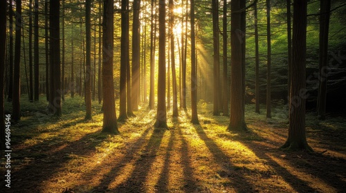 © Nonnarit, Fototapeta premium Golden sunlight streaming through the trees in a dense forest, casting long shadows on the forest floor