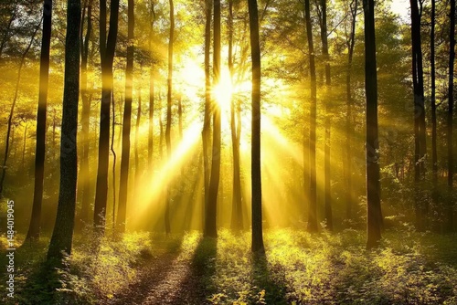 © choirun, Obraz premium Golden sunlight streams through a dense forest.
